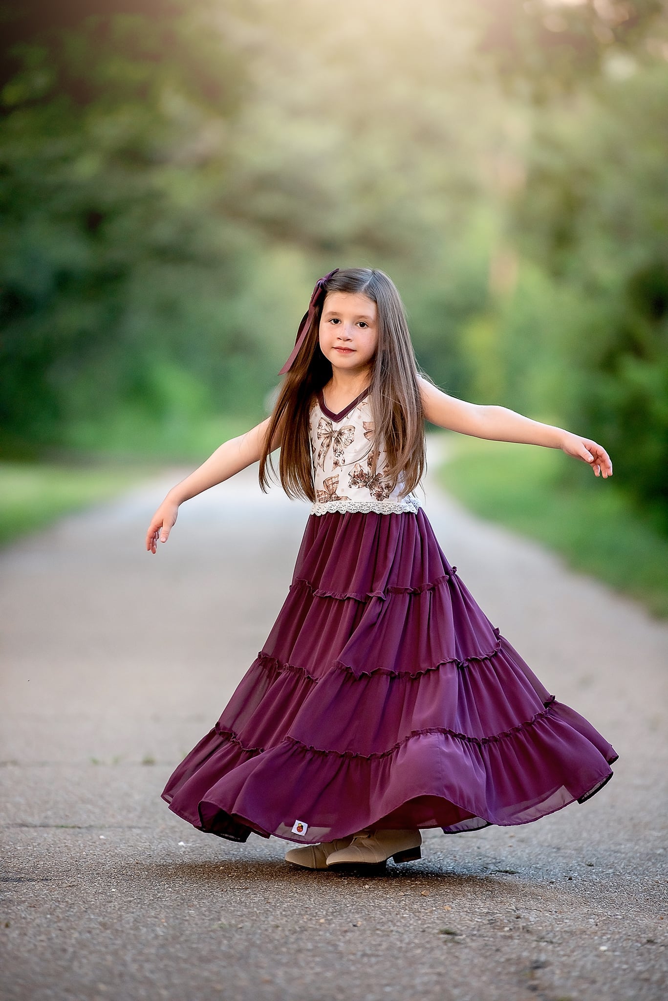 A stylish crisscross optional detail gives it an extra unique flair, making it both eye-catching and functional to adjust length. The flowy, tiered skirt cascades beautifully, offering maximum twirl potential. Perfect for making magical memories, whether twirling through a fall day or celebrating a special occasion!