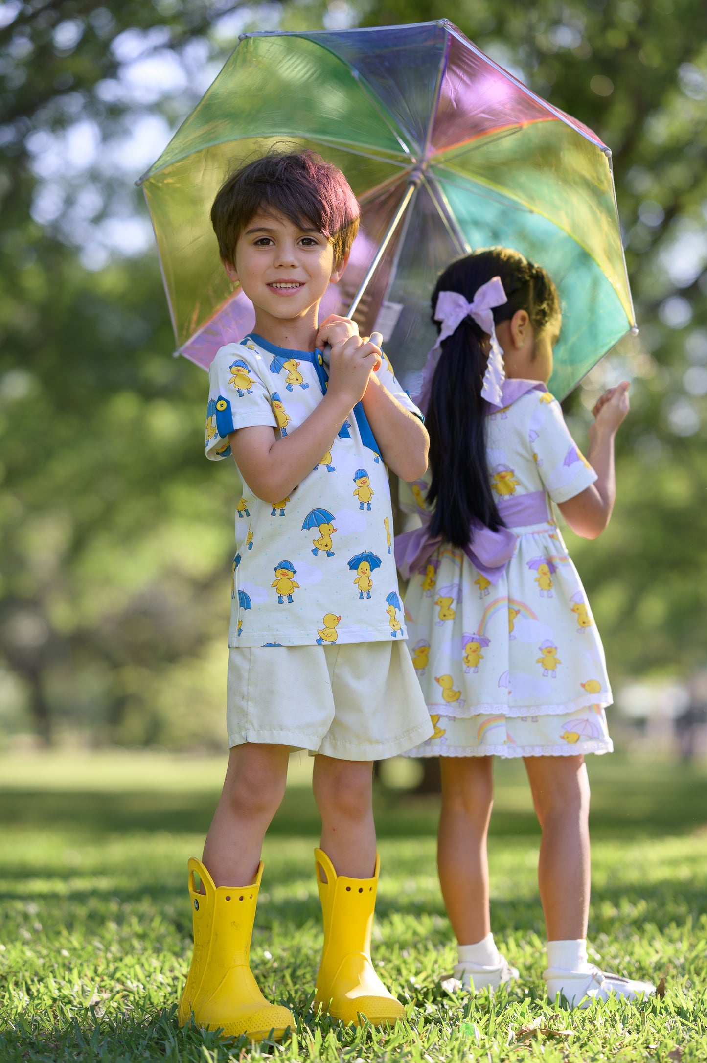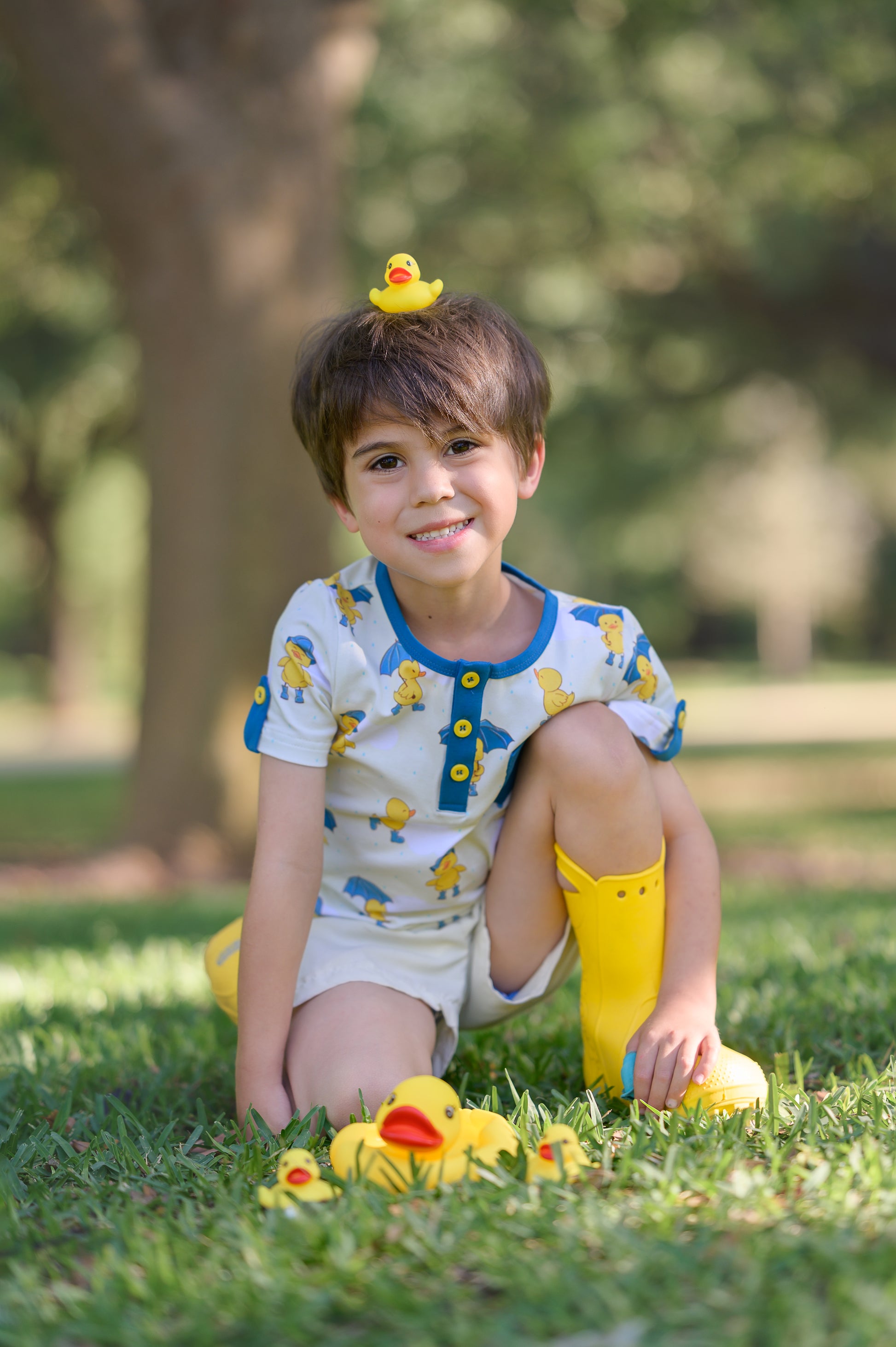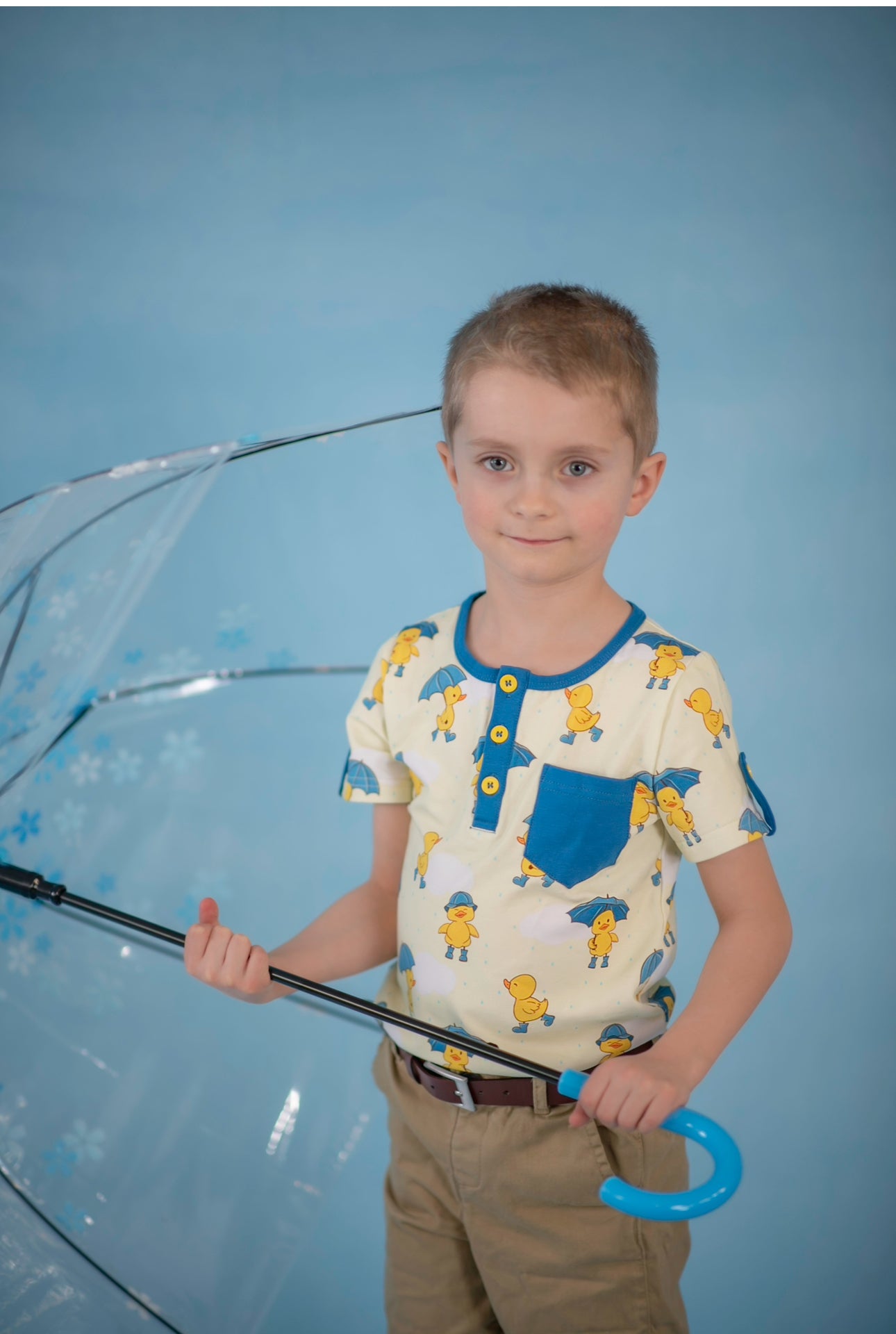 Our Puddle Pals shirt is sure to infuse a playful touch into your little man's wardrobe. The soft and comfy fabric has the most cheerful custom print featuring cute little ducks wearing vibrant blue rain boots (and some lucky ducks even have matching blue umbrellas!). You won't see this fabric or design anywhere else (and it's a perfect complement to the Puddle Pals dress whose ducks have lavender boots and umbrellas).